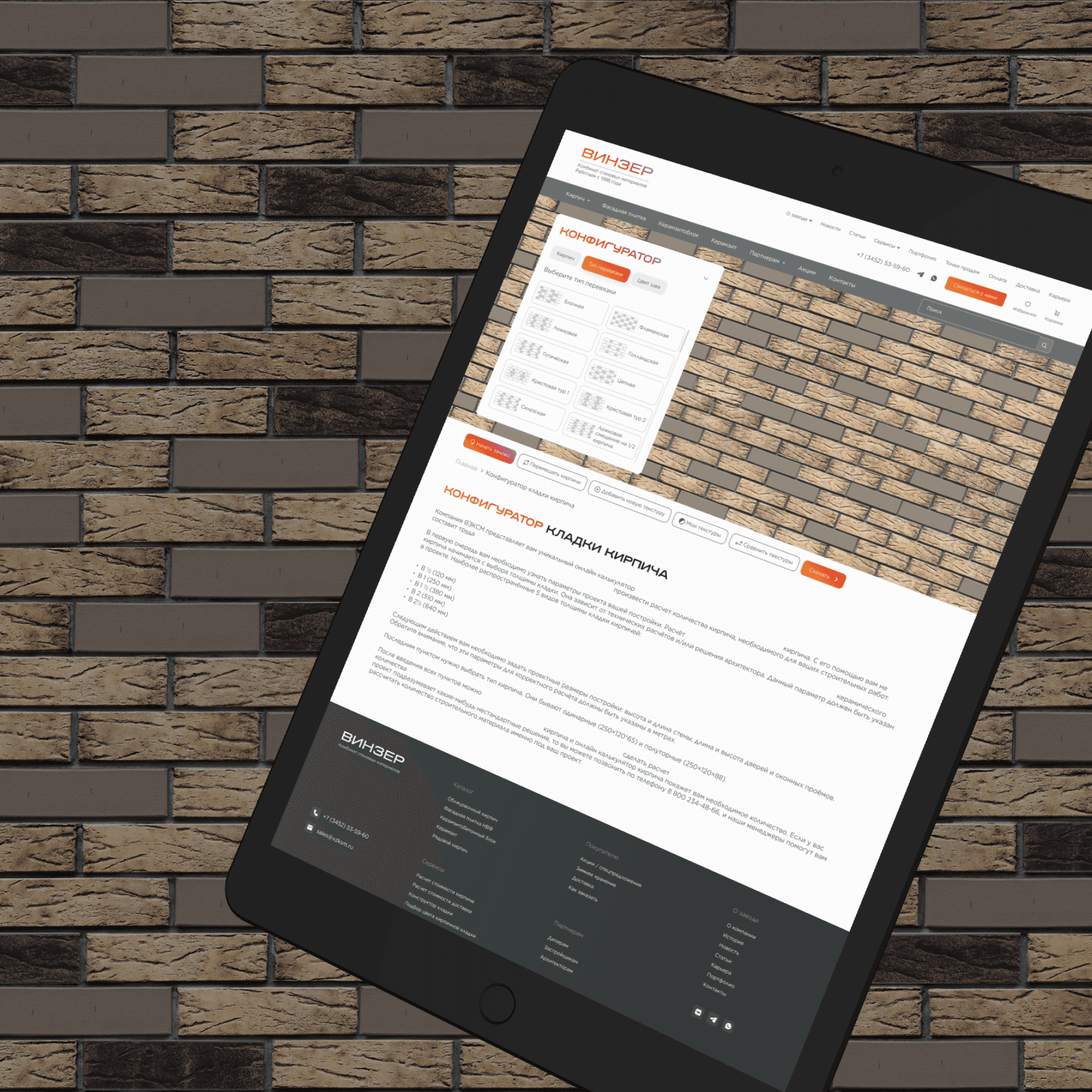 Встроенные калькуляторы кирпича и блоков, конфигуратор кладки, быстрый поиск по параметрам.