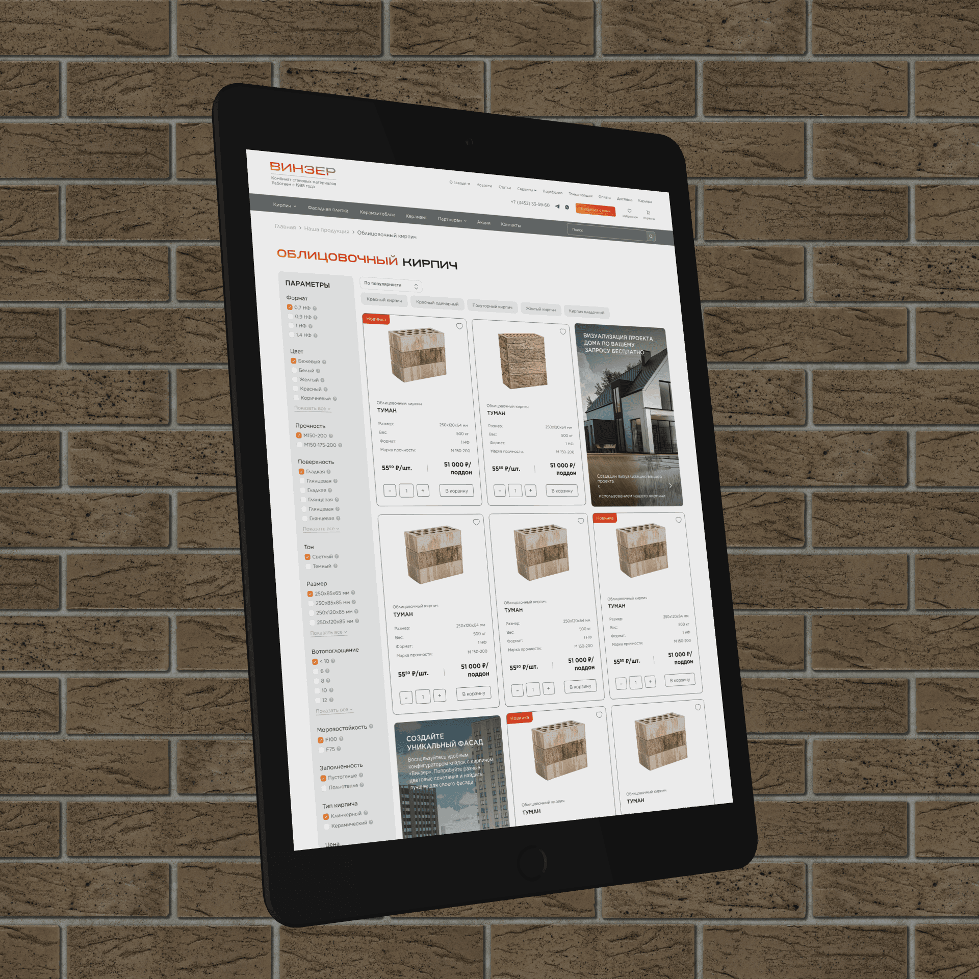 Сделать удобную фильтрацию по типам продукции, формату, цвету, размерам, морозостойкости и другим параметрам.