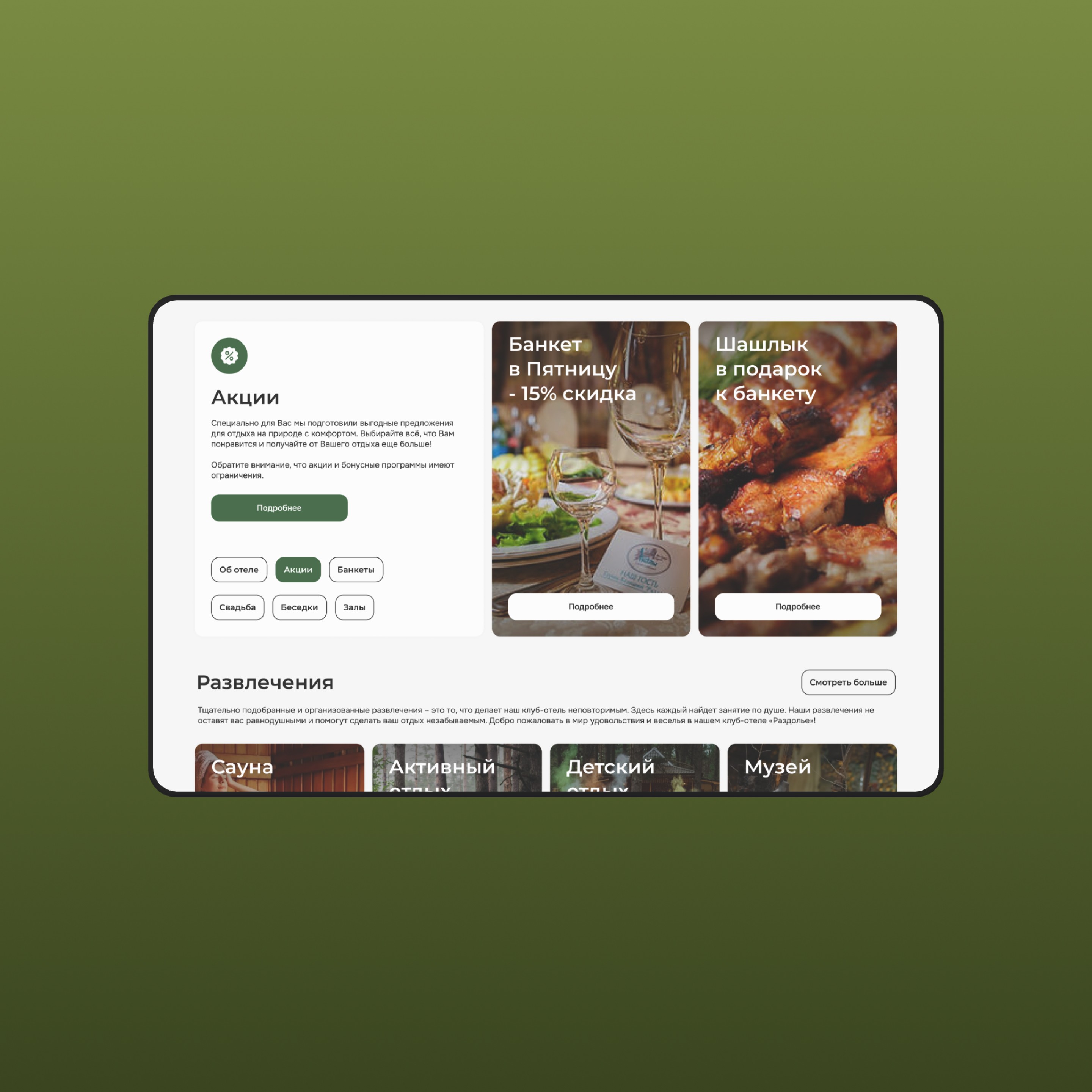 Отель-клуб премиум-класса обратился с запросом на редизайн корпоративного сайта с целью создания современной, интуитивно понятной платформы, которая демонстрирует уникальные преимущества отеля, упрощает процесс бронирования и привлекает как туристов, так и деловых гостей