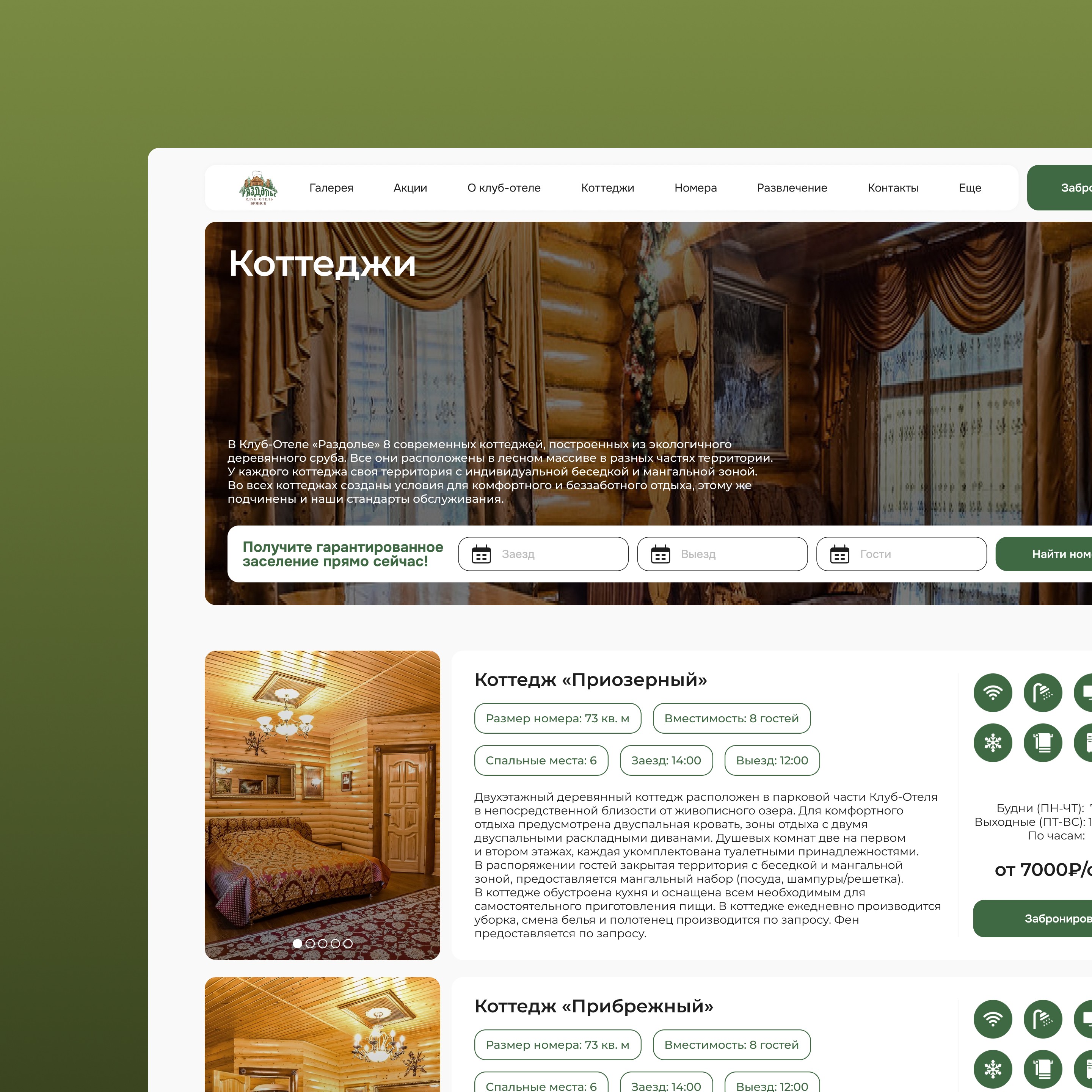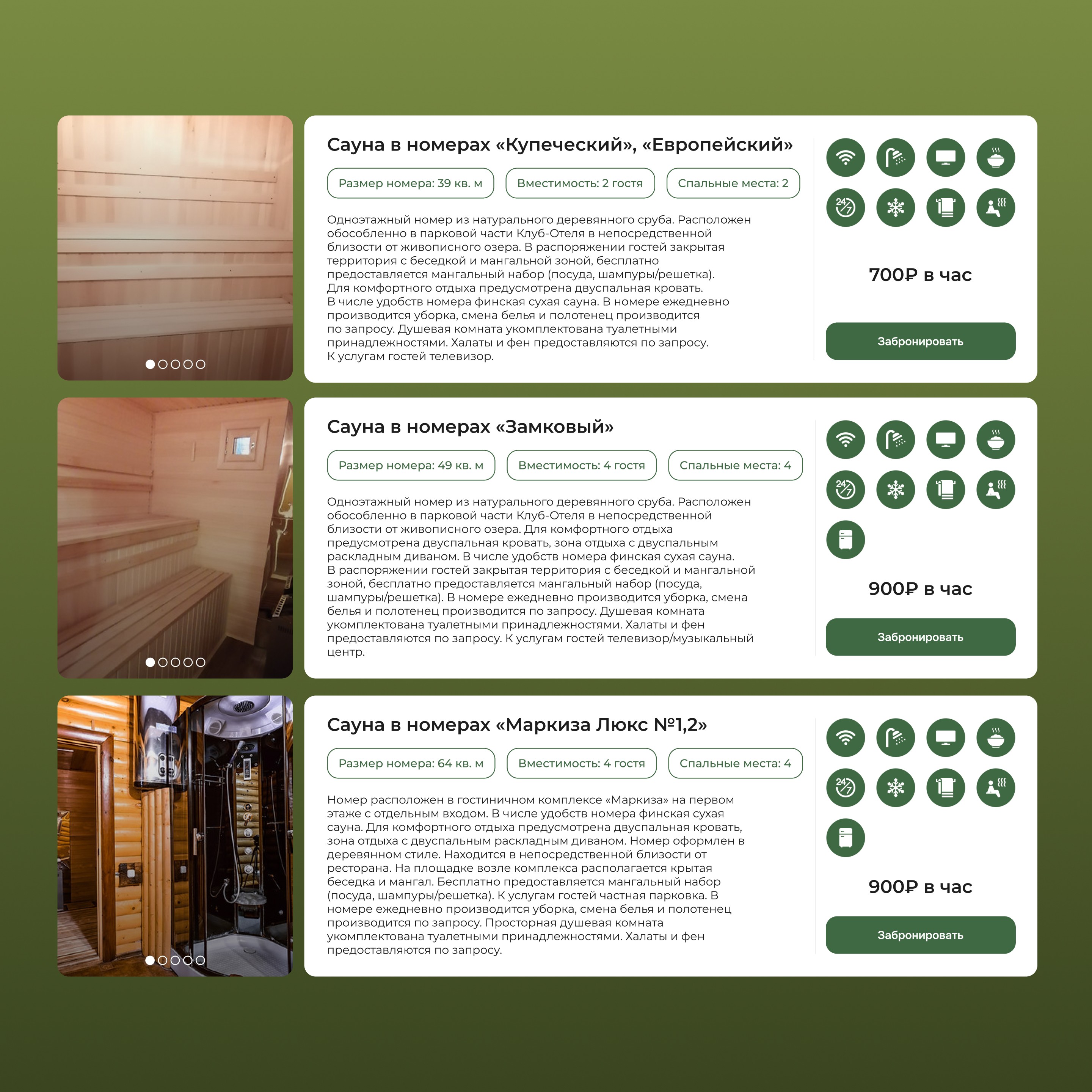 Каждая карточка содержит ключевую информацию: описание, фотографии, доступные даты и стоимость. Интерактивные элементы, такие как календарь и блоки CTA (Call-to-Action), способствуют быстрой навигации.