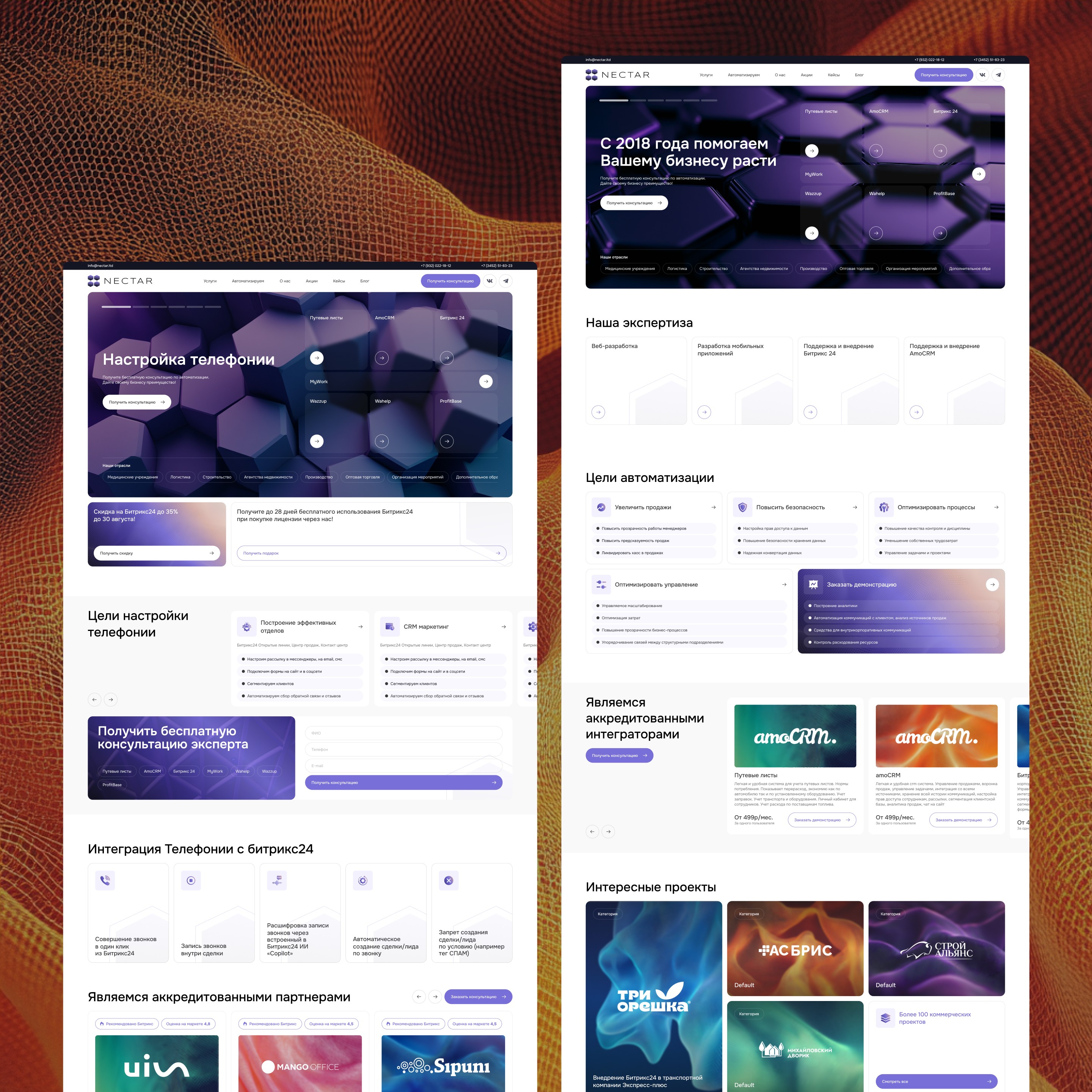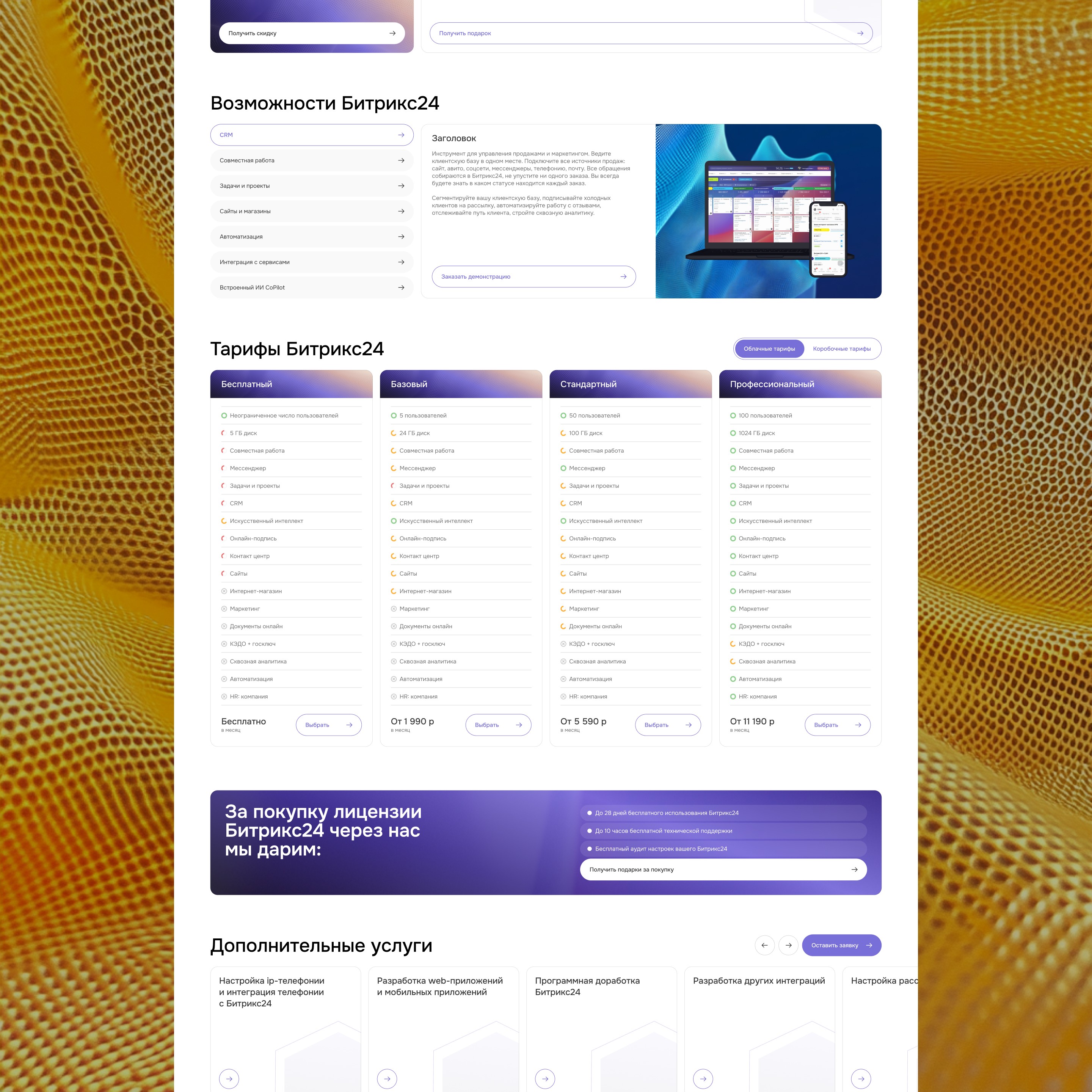 Для разных сегментов клиентов требовалось создать отдельные секции с релевантной информацией: интеграции, заказная разработка, партнерские программы, услуги.